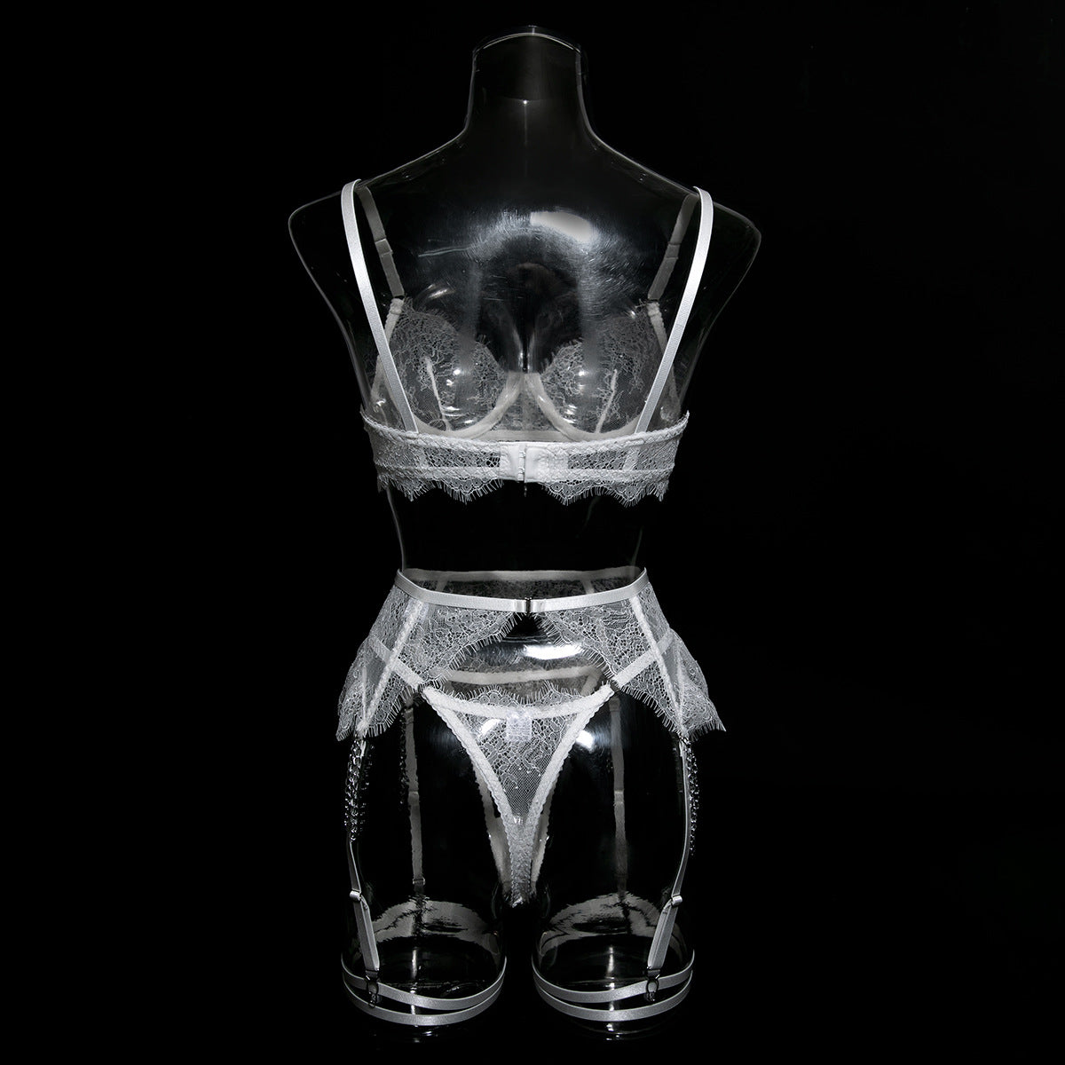 This stunning 5-piece set features intricate lace detailing, a ruffled garter belt, matching thong, and coordinating thigh garters. Delicate little chain accents add just the right touch of daring, exuding a “naughty-but-nice” allure in the most sophisticated way. Perfect as boudoir lingerie or an elegant choice for your wedding night, this set whispers delicate while burning with a fiery edge - making you feel irresistibly seductive and unapologetically confident.