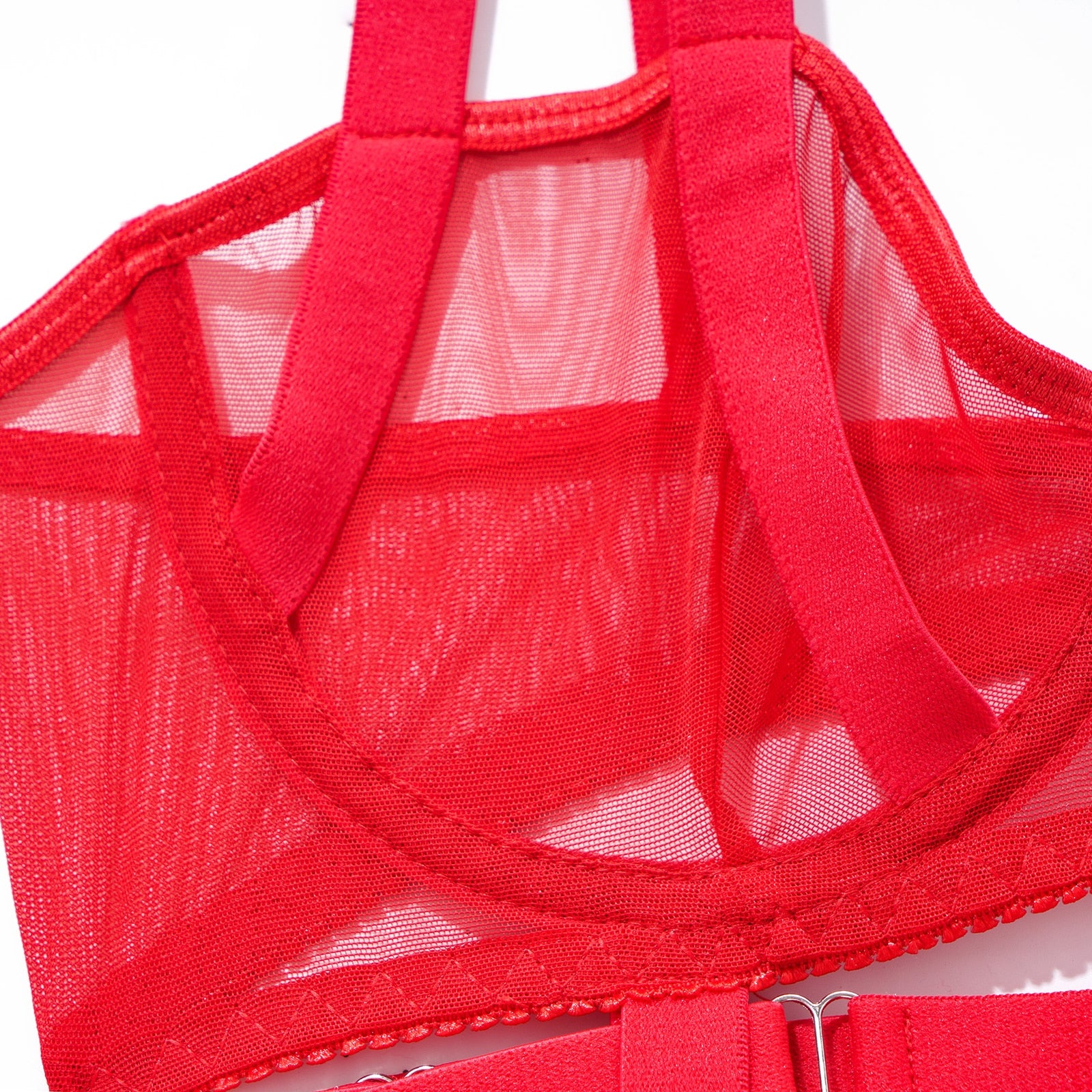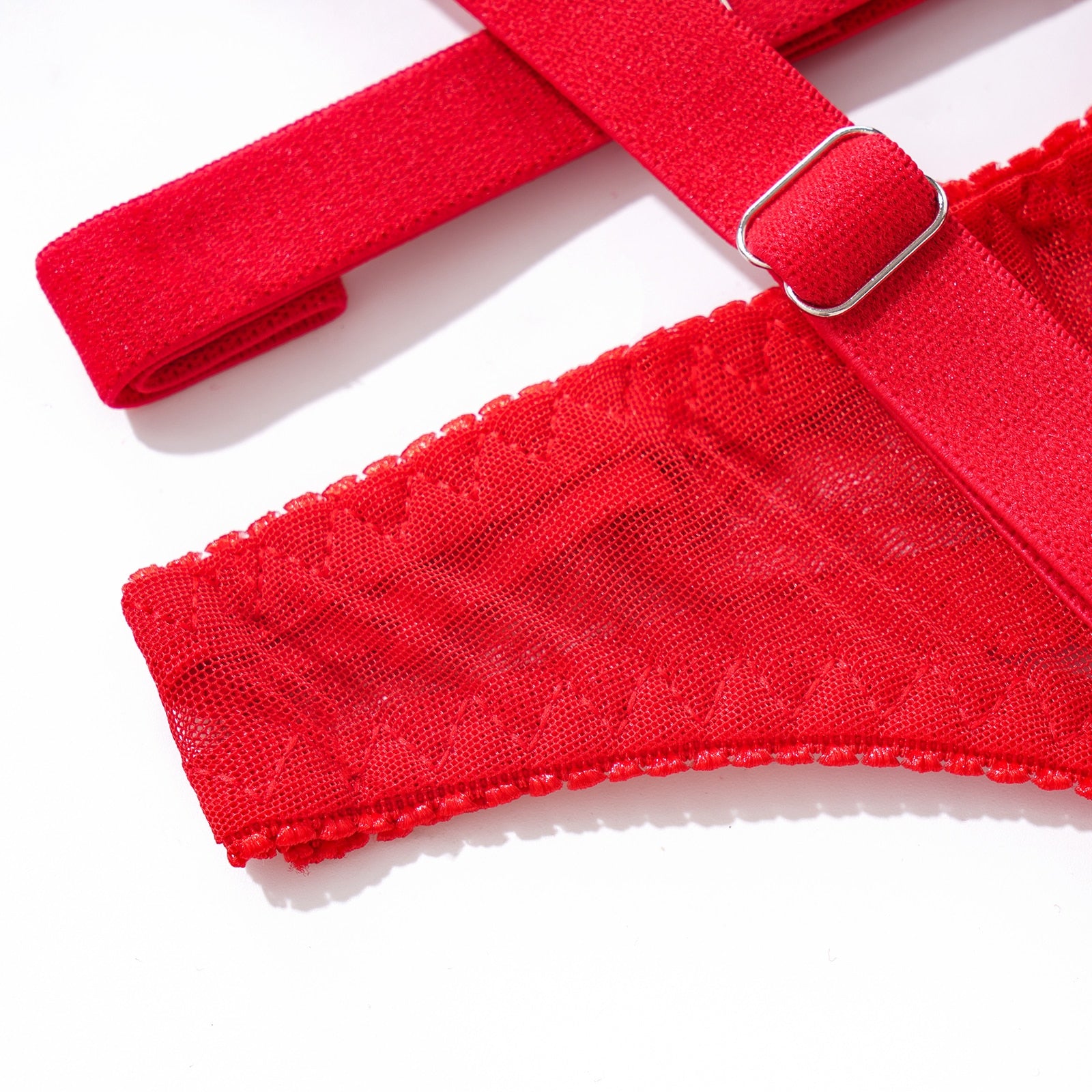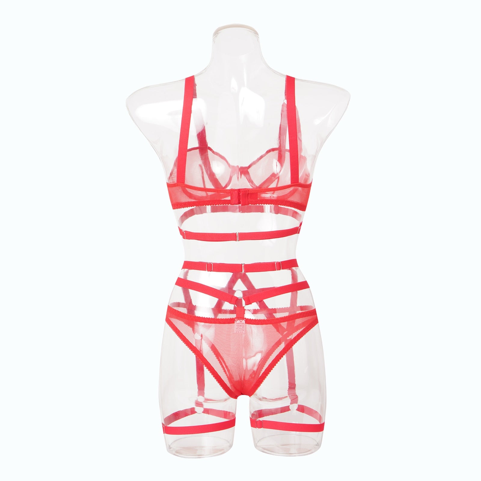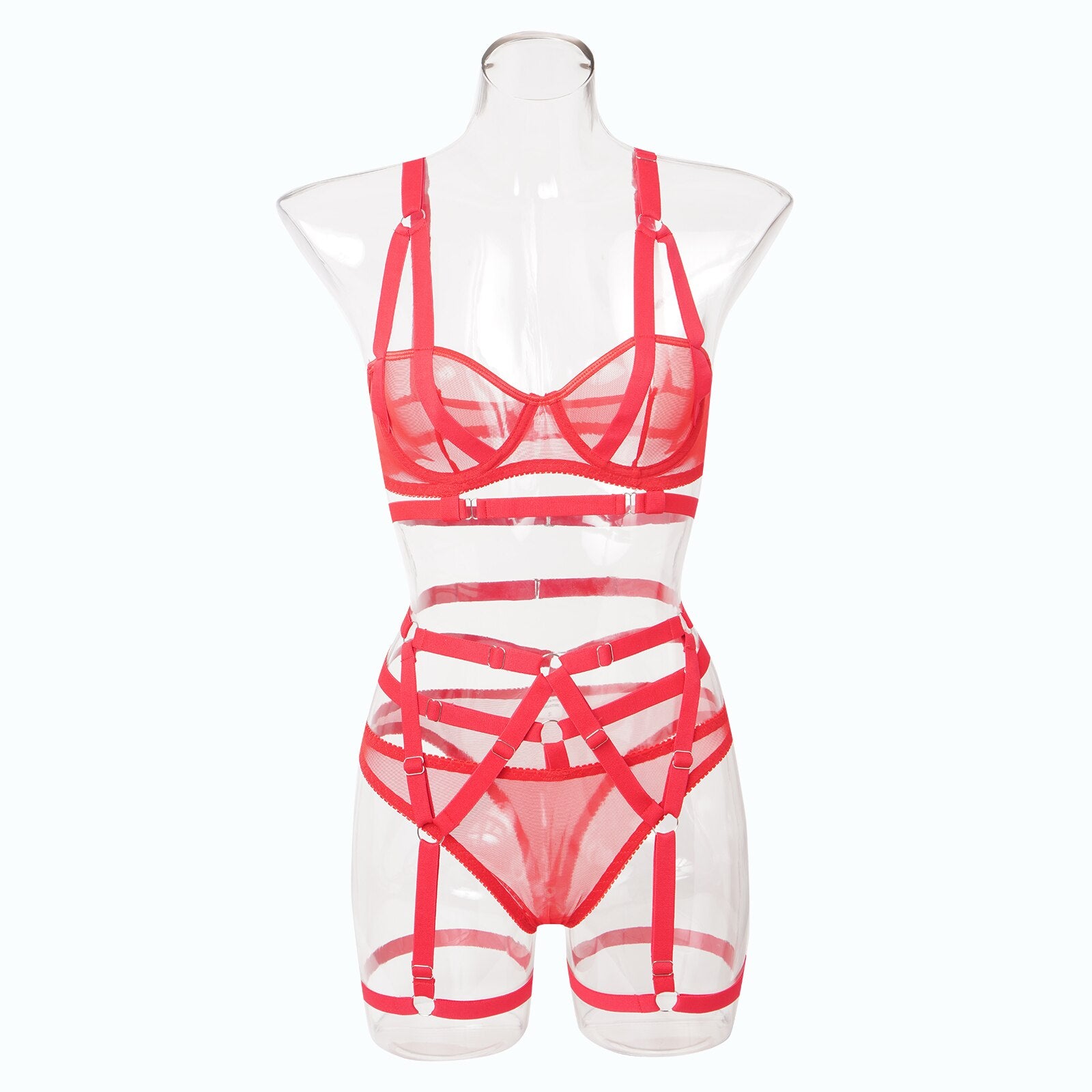 Classic lingerie with intricate straps. Give your night or boudoir photoshoot a kinky edge with this set. Comes with bra, panties, belt and garters. Other colors in this set include black and white (also available in our shop).